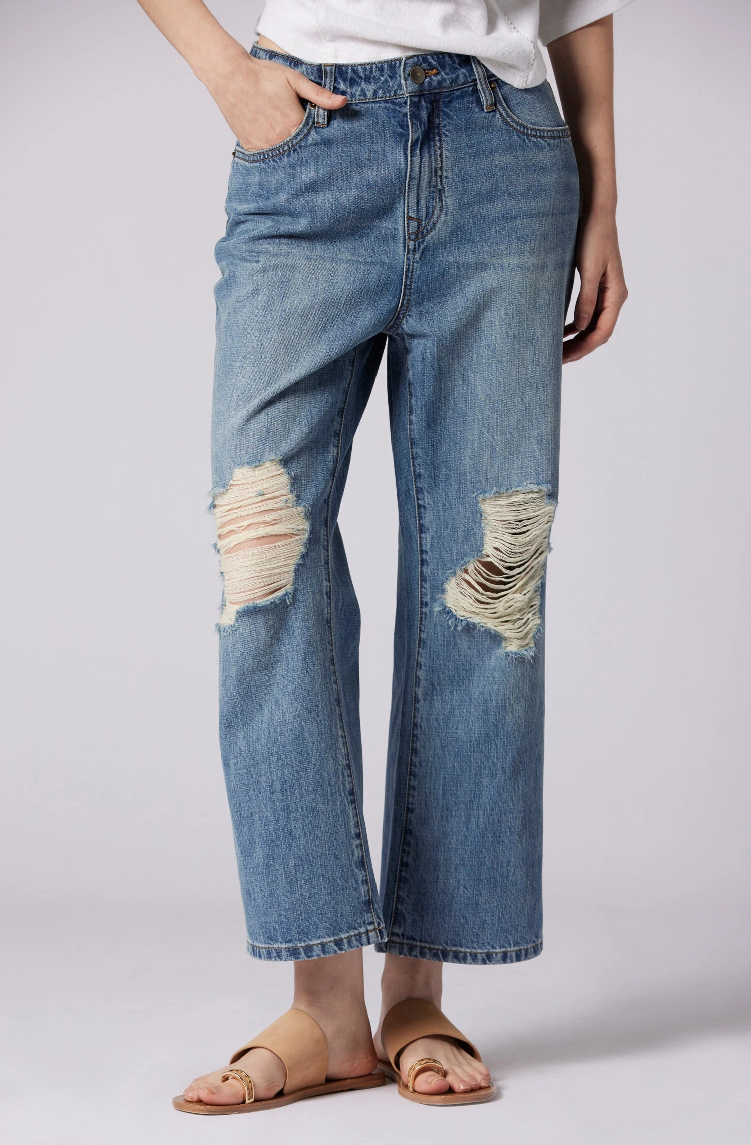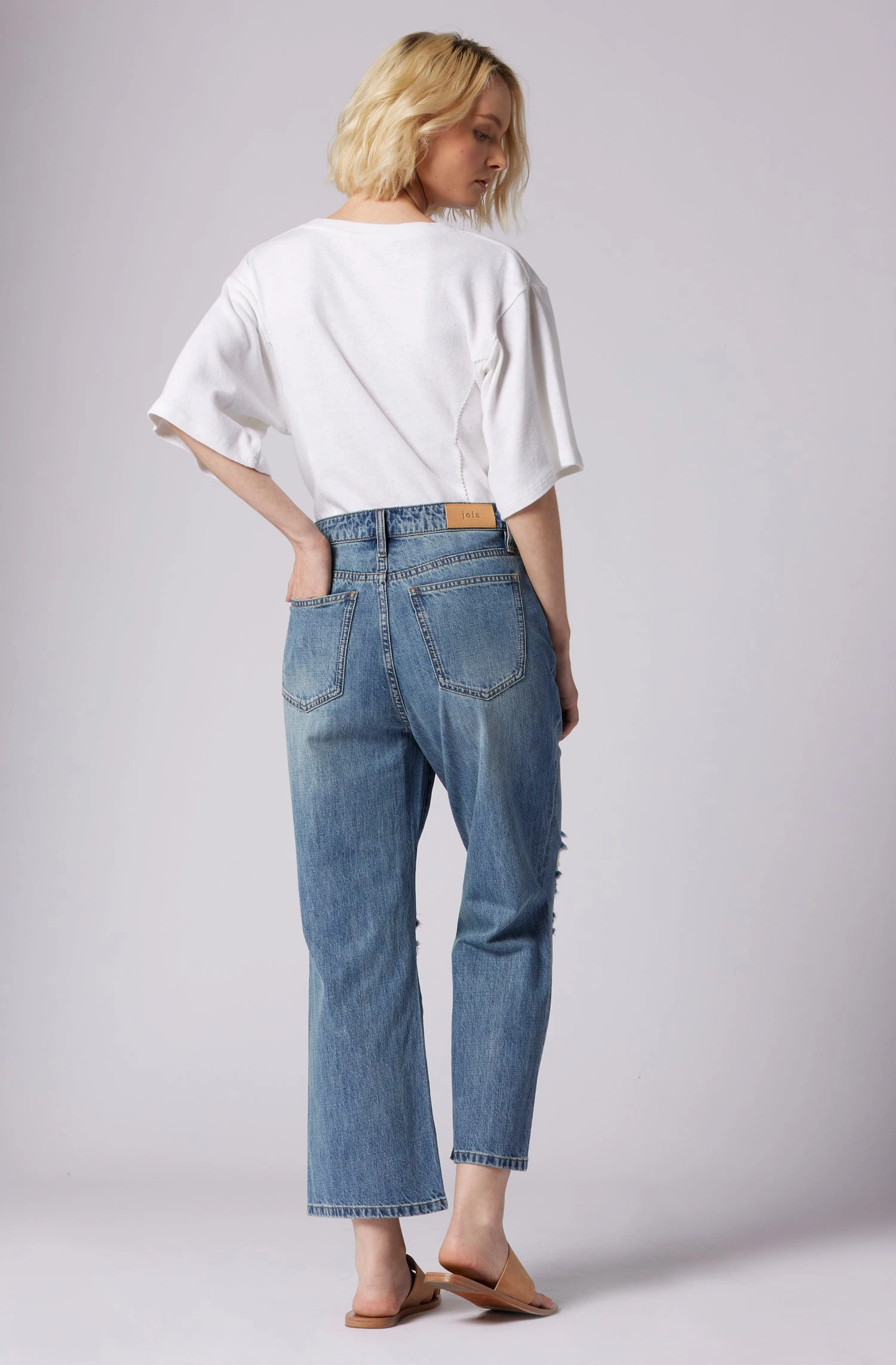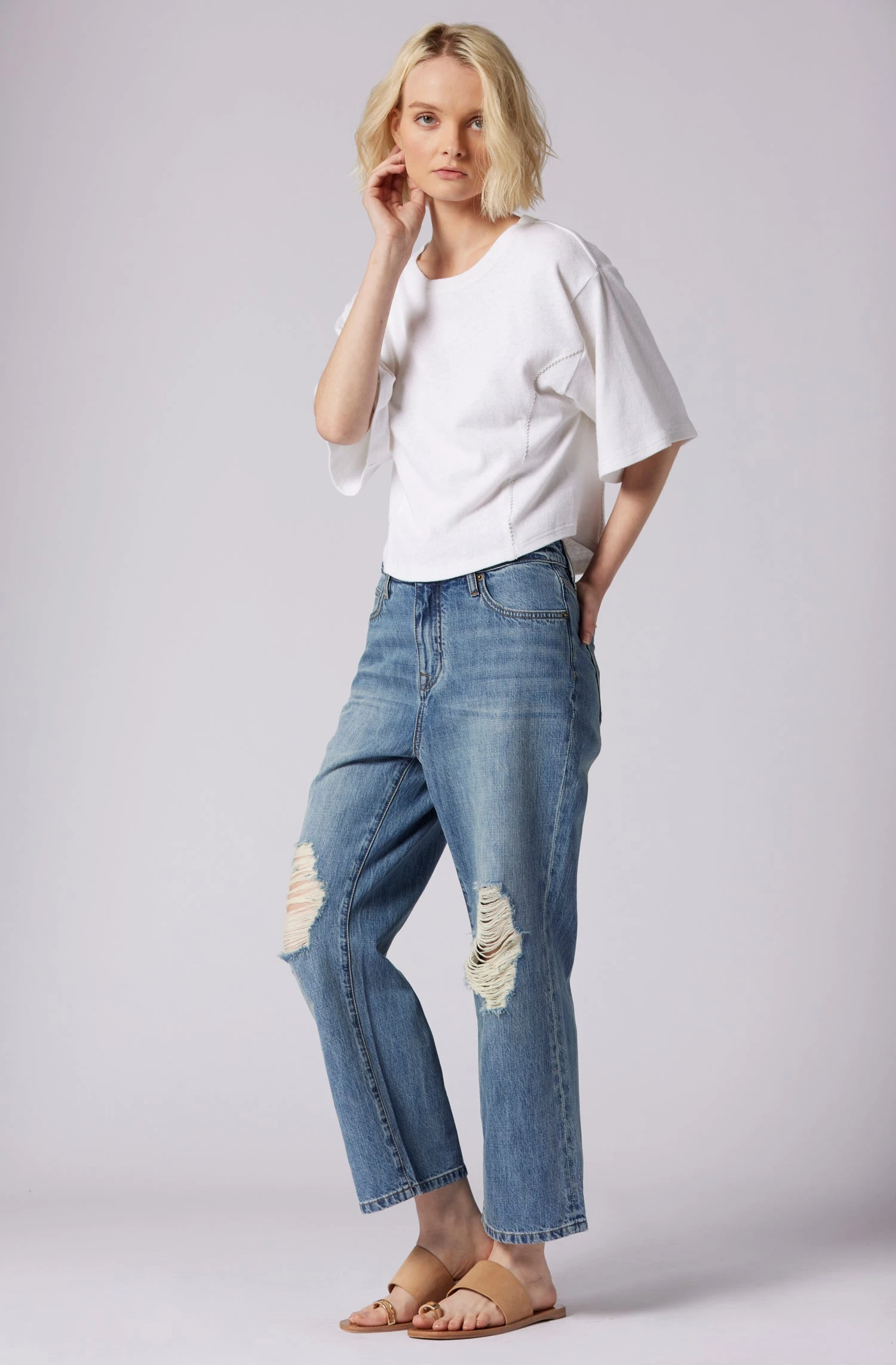 The Evie is the easiest denim to wear this summer. Distressed details, cropped leg, and a relaxed fit; pair this denim design with your favorite tee and look stylish instantly.