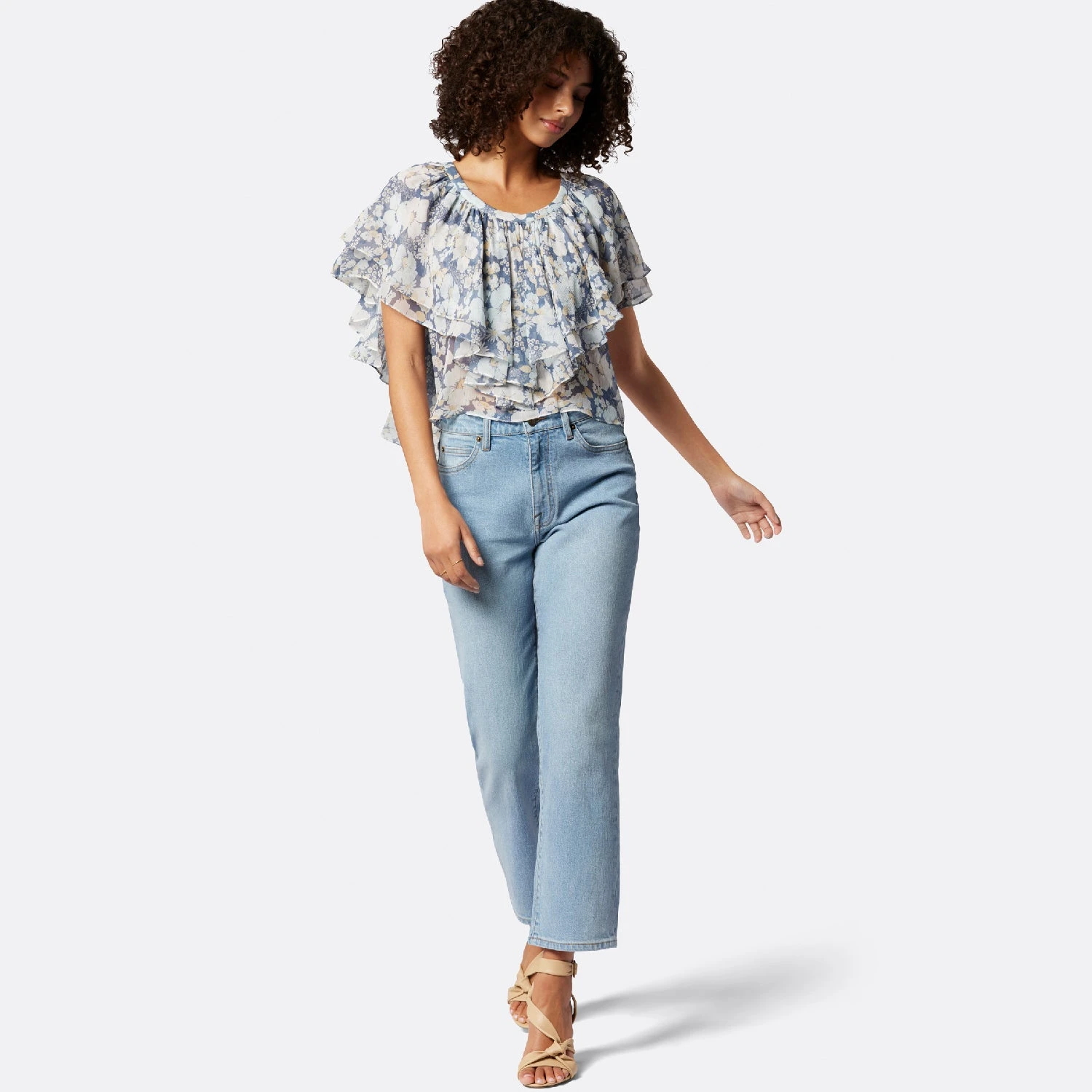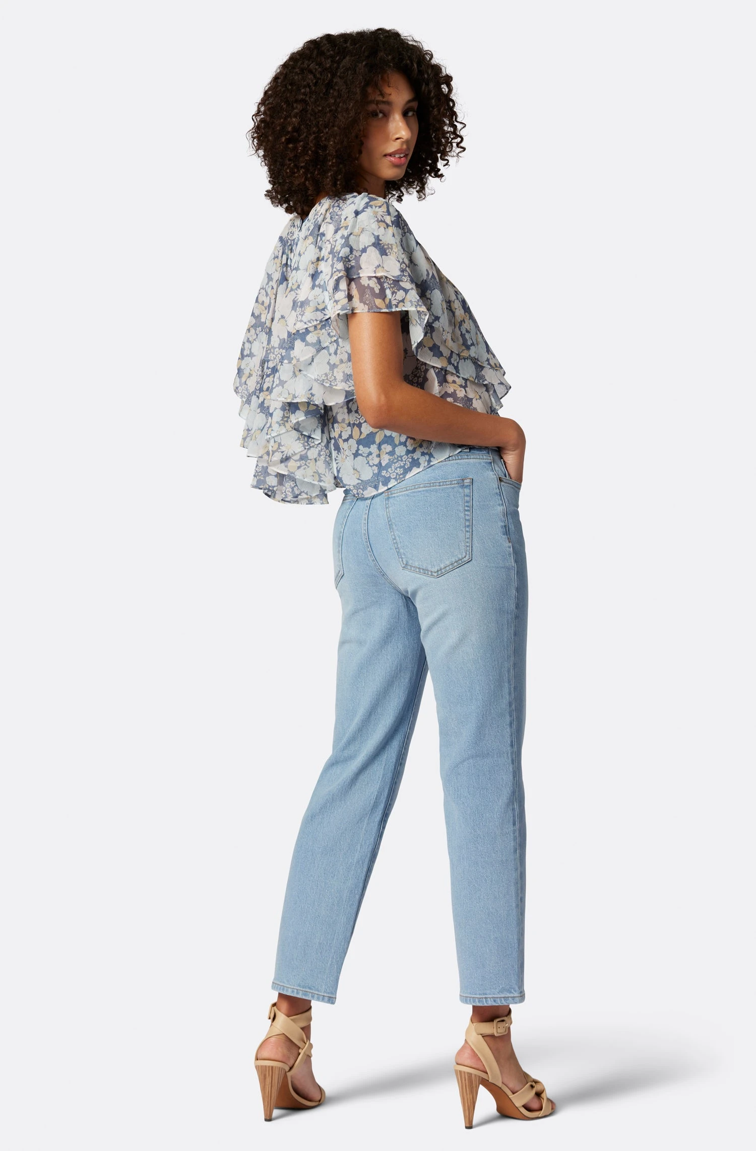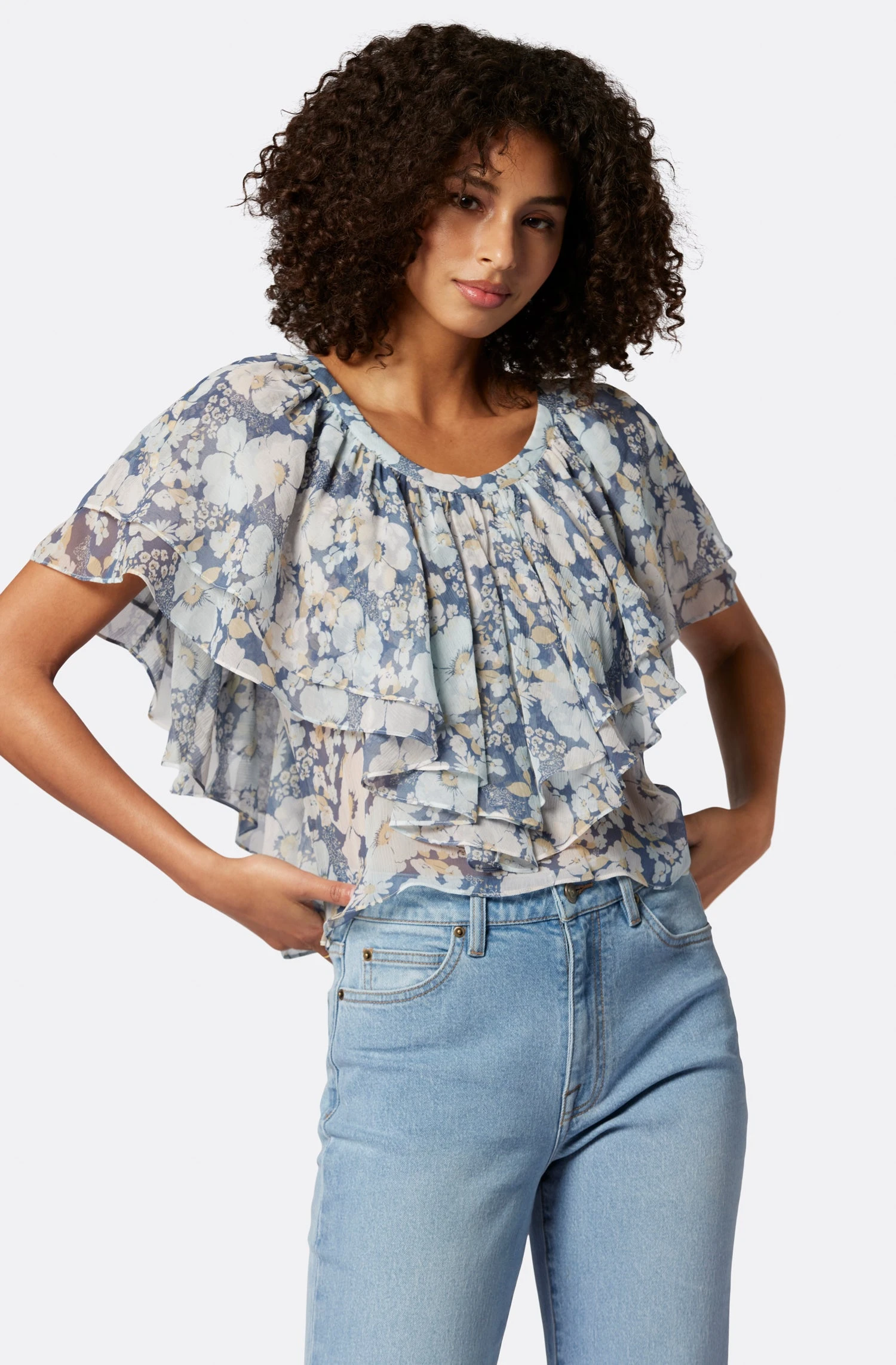 The Larisa feels like a walking work of art with how effortlessly it moves when you wear it. This crop silk design features ruffled layers and an asymmetrical hem and looks great with any of our Joie denim.