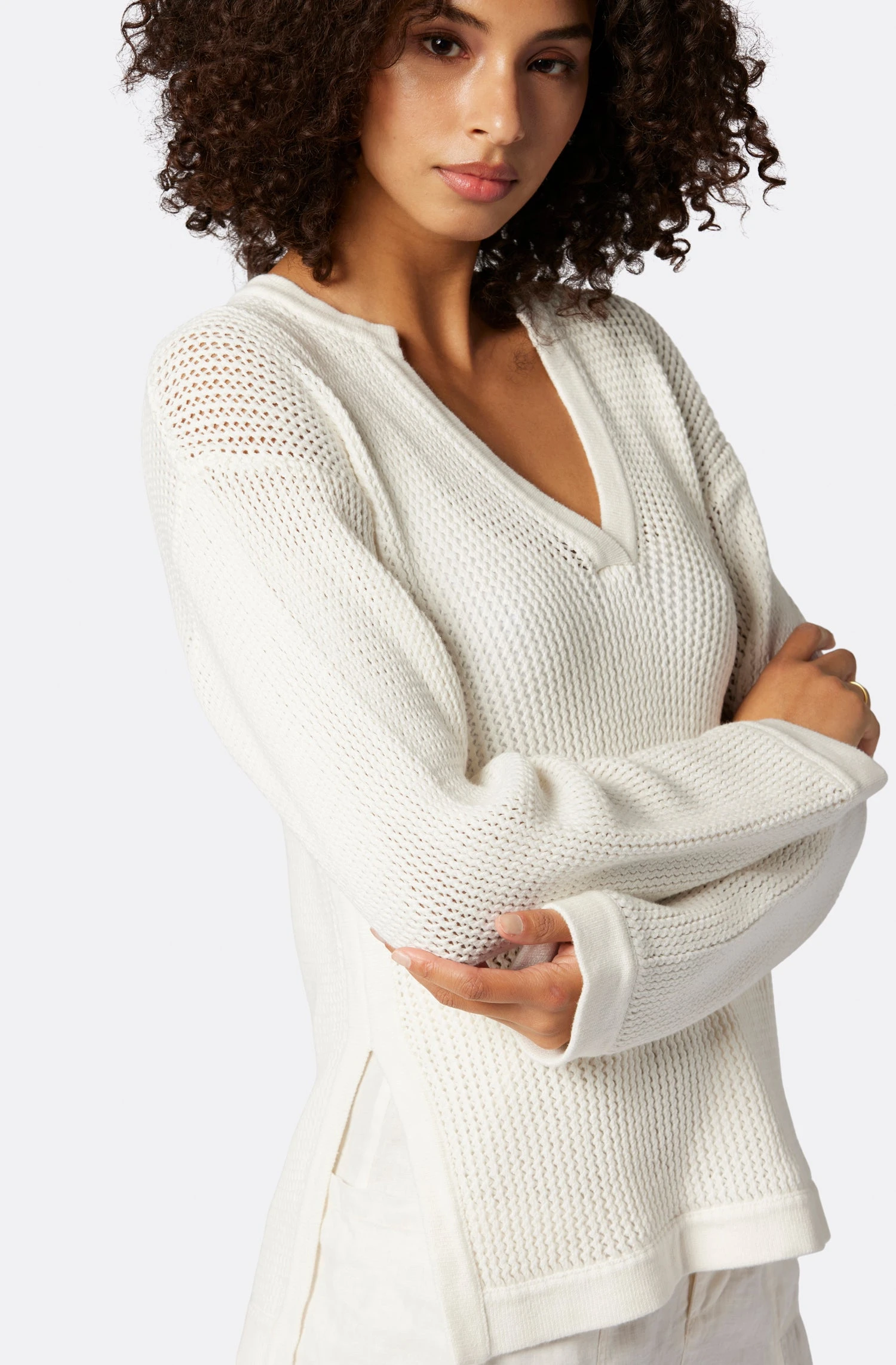 Fitted shape, side slits, and a V-neckline; this mesh crochet sweater is your new elevated essential.��