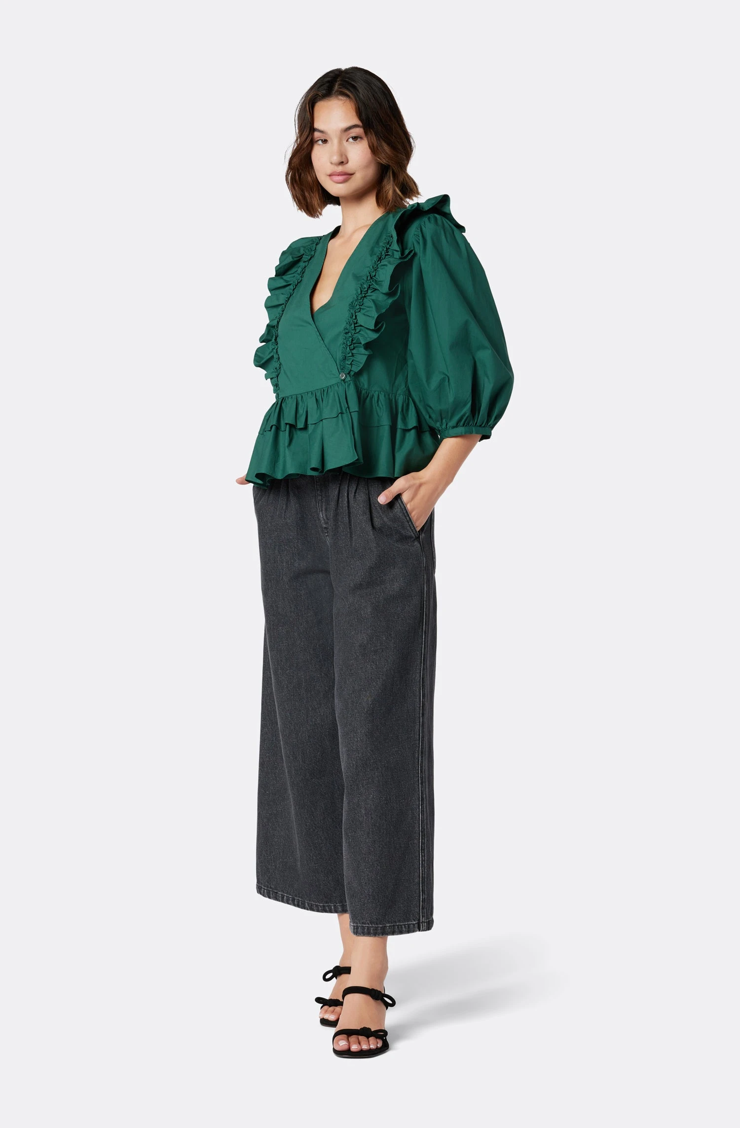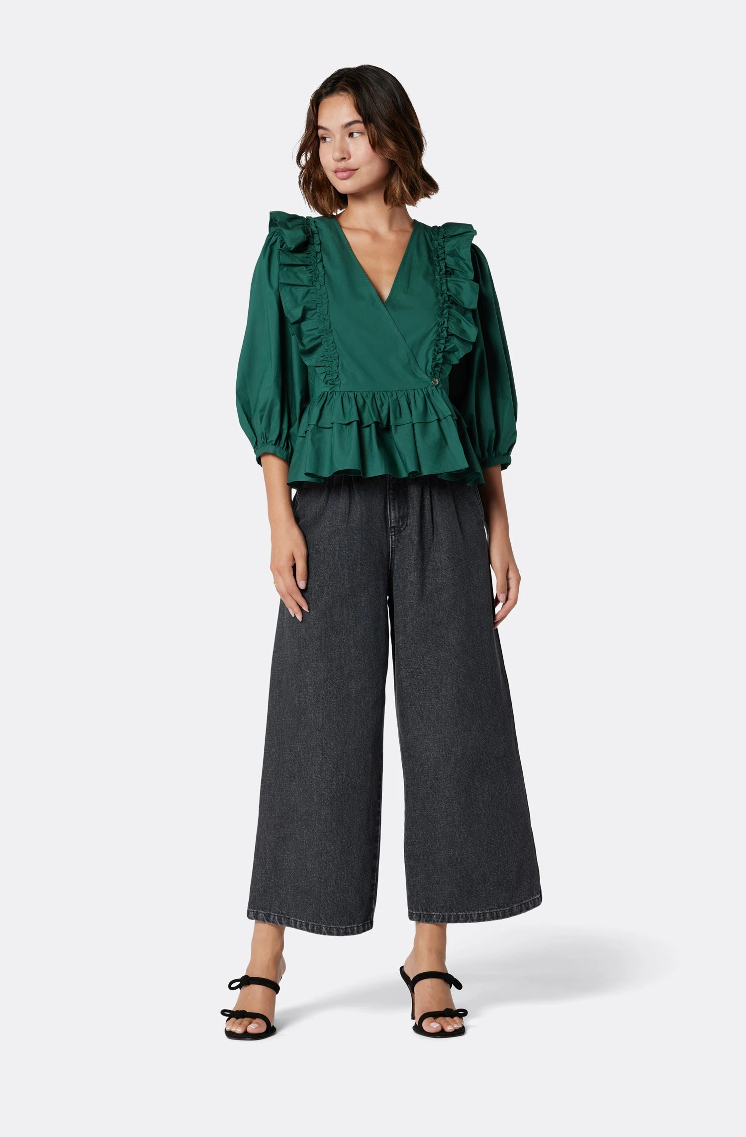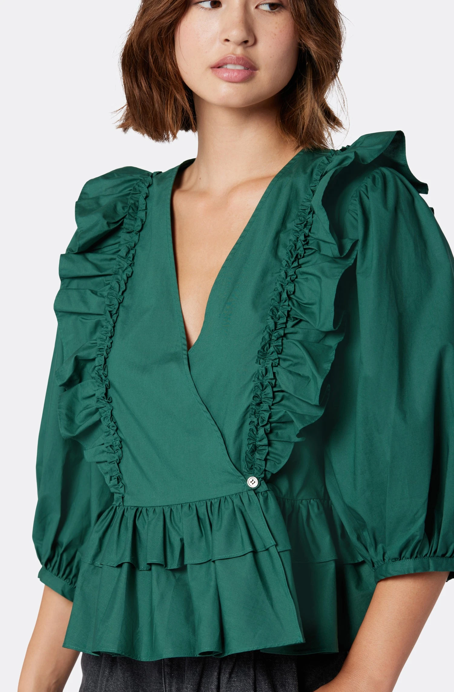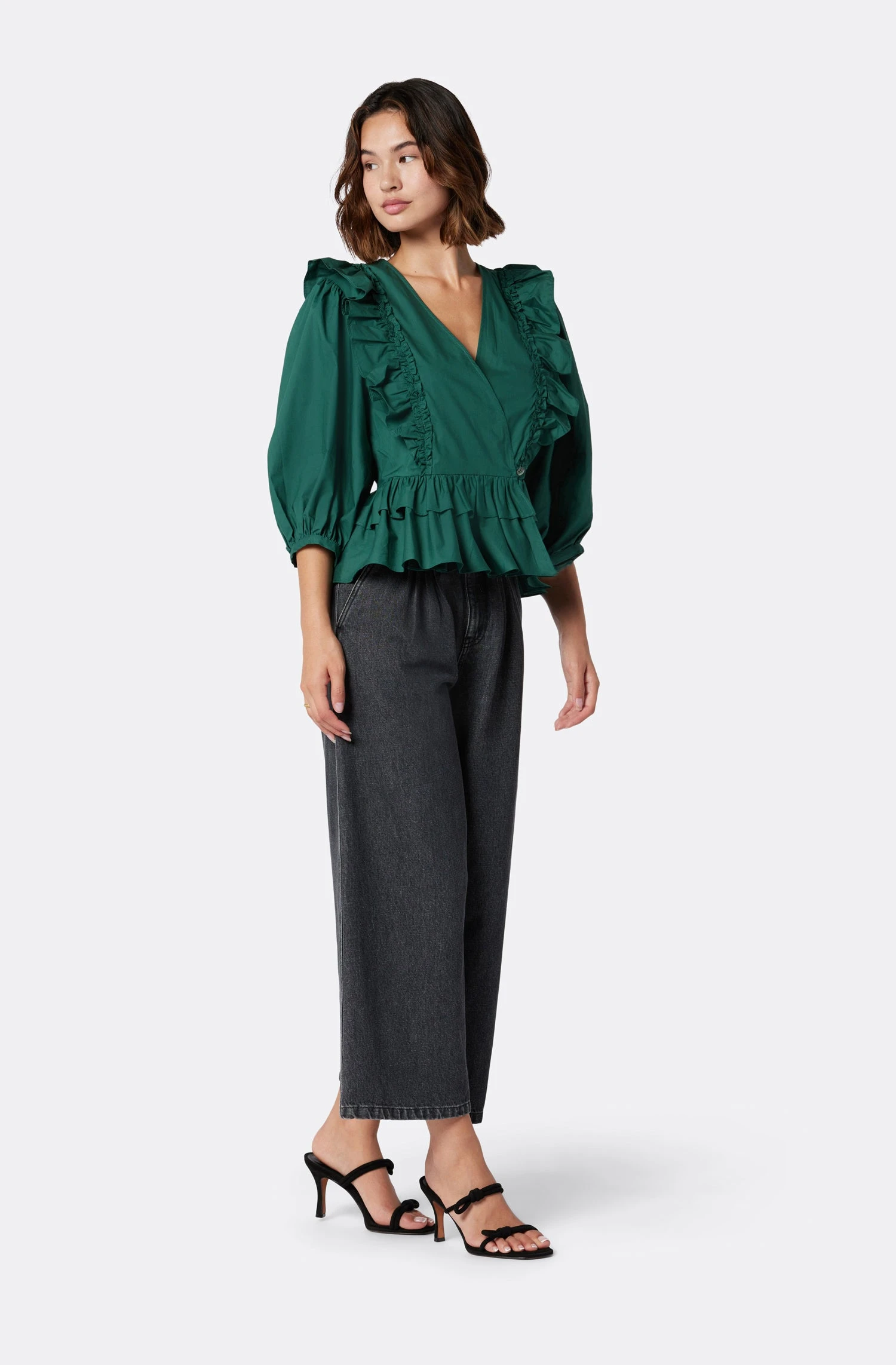 A modern and maximalist take on the peplum silhouette, this top features cascading ruffles at all angles, making it a standout wardrobe staple. With its structured shape and faux wrap waist, The Nellis is easy to wear while still flattering your figure.